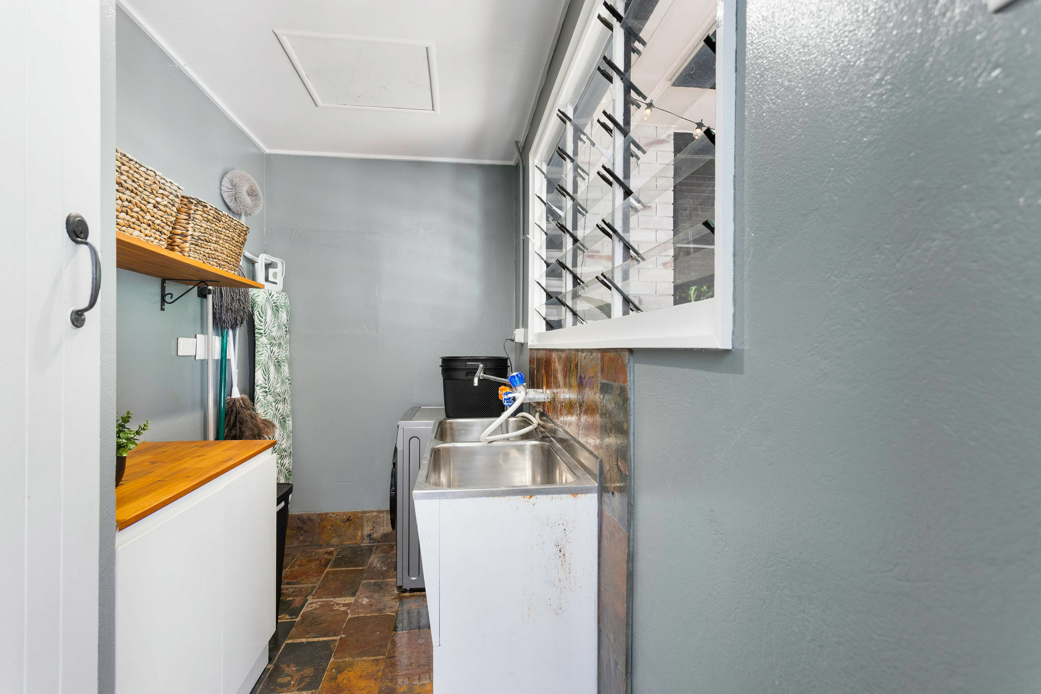 Private full length entertainment area with slate floor and access to powder room and laundry.