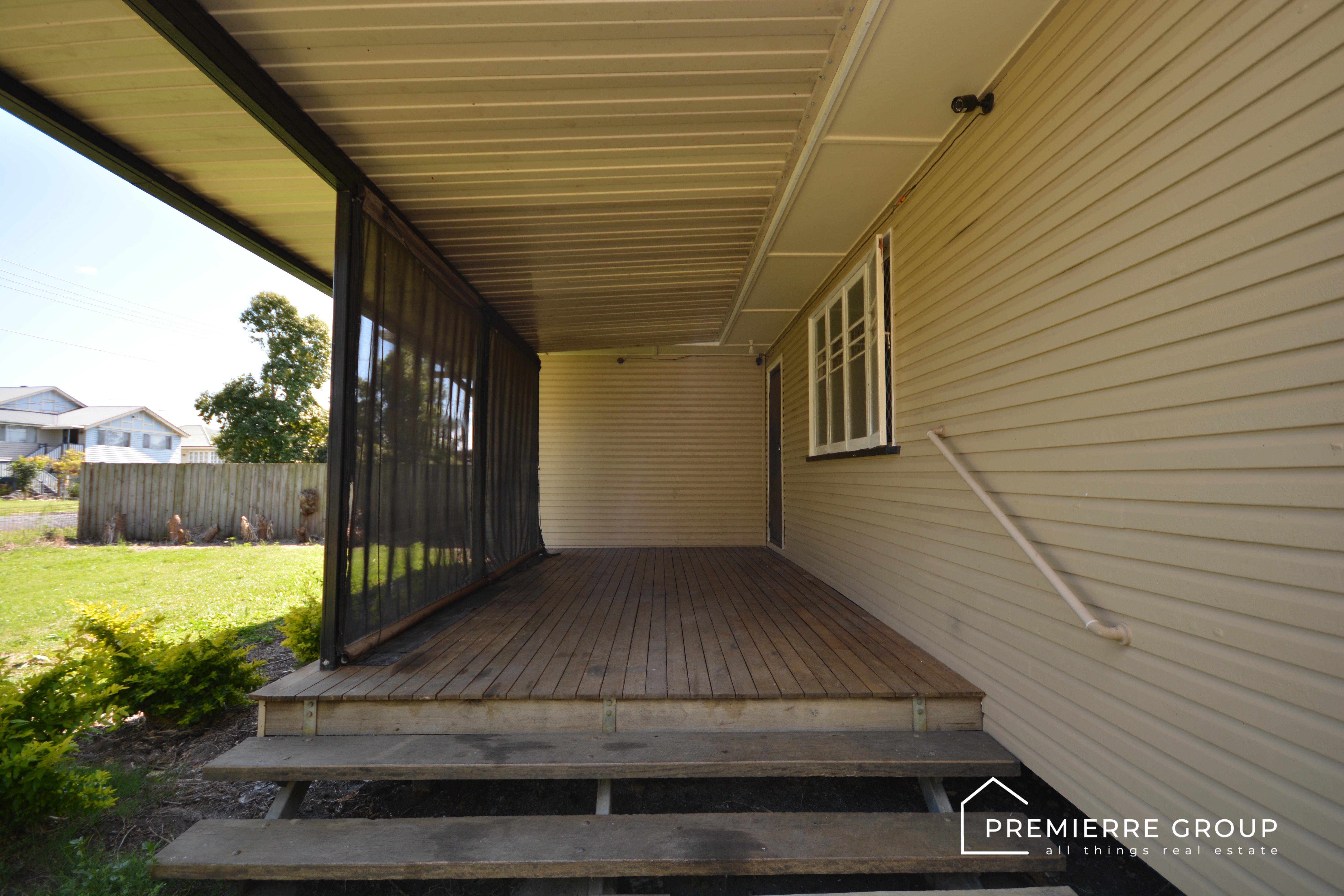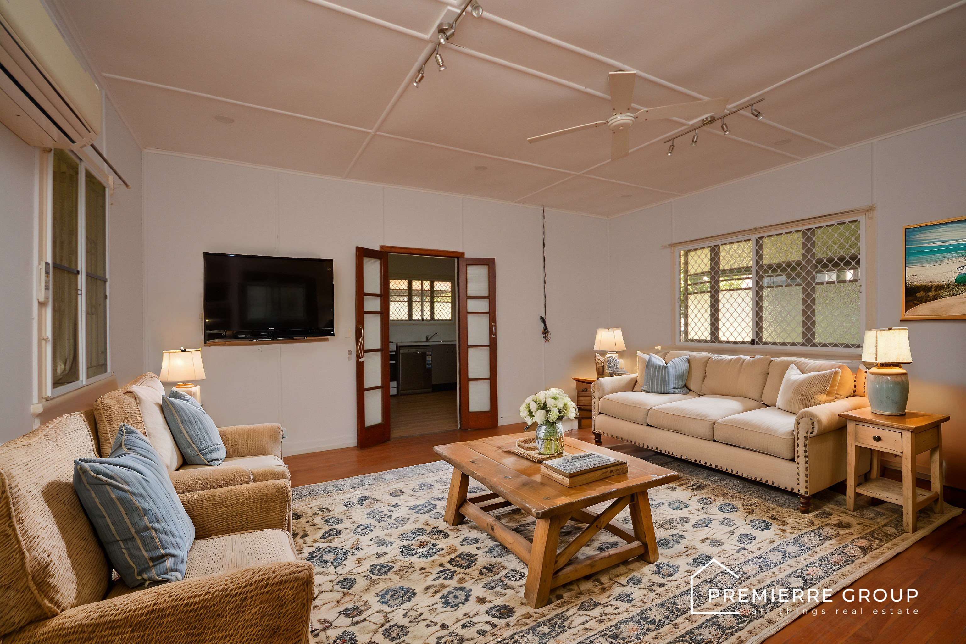 Step inside, and you’ll be greeted by high ceilings, French doors, and gorgeous honey-colored polished floors that add warmth and charm to the living spaces. A split-system air conditioner ensures comfort year-round, and all three bedrooms are generously sized, each equipped with remote ceiling fans and security grills. The master also boasts a large built-in robe for extra storage.