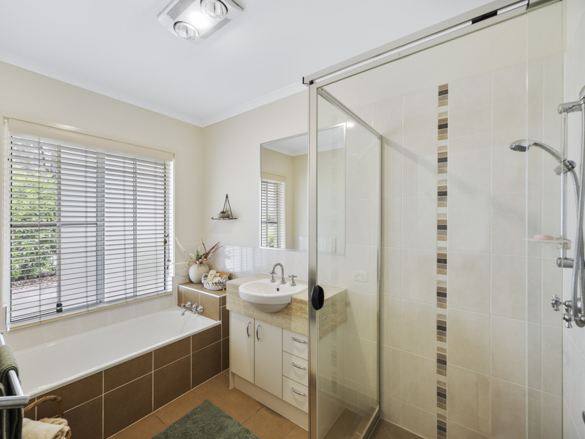 Outside, you'll find a tranquil patio with lights and power covered by a grand gable roof and elegant epoxy flooring, perfect for alfresco dining or simply enjoying the peaceful setting. The backyard offers ample space for children's play equipment, and the double garage, with durable painted flooring, adds to the home's polished finish. High ceilings throughout create an airy, spacious feel, and storage is well catered for with a large 3-door linen cupboard in the hallway.
