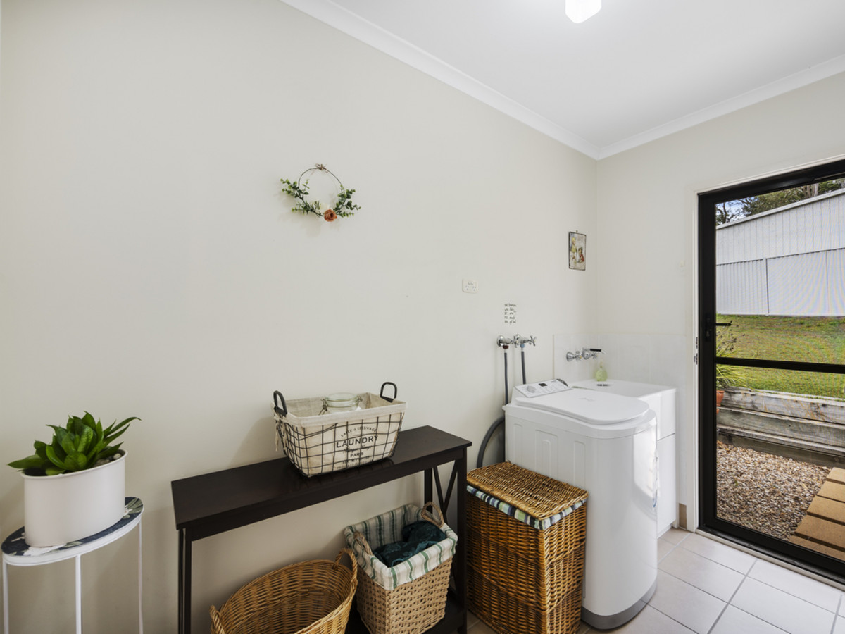 The main bathroom includes a separate shower and bath, while a separate toilet enhances the home's practicality. The laundry is generously sized and provides direct access to the backyard for added convenience.