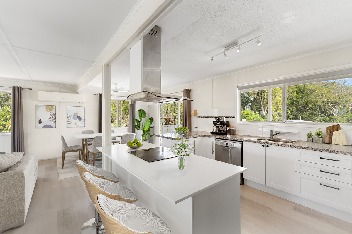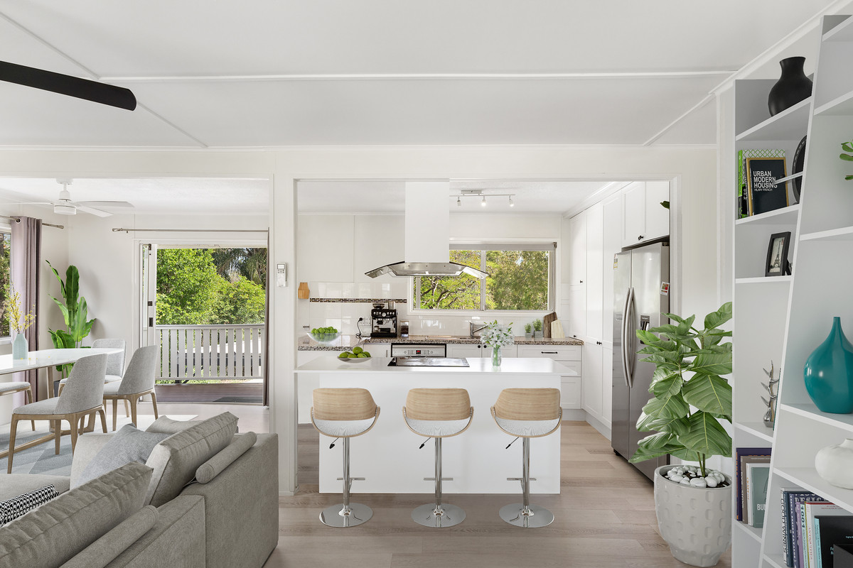 Entering inside, the stylish upper level unveils an open lounge and dining area extending out to two elevated balconies. Kept cool with air-conditioning, this living space adjoins the central kitchen appointed with stone benchtops, stainless steel appliances and an island bench with breakfast bar.